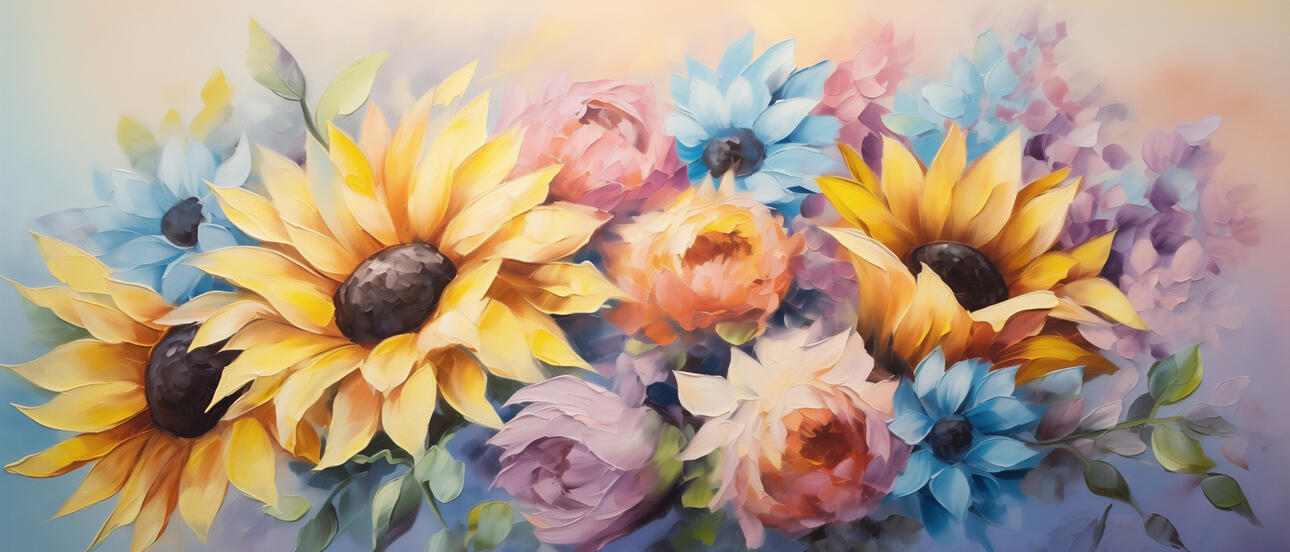 | Basket of flowers, Brightlily, Campanula, Chrysanthemum, Hydrangea, Lily of the valley, Sunflower bouquet, Sweet pea. |